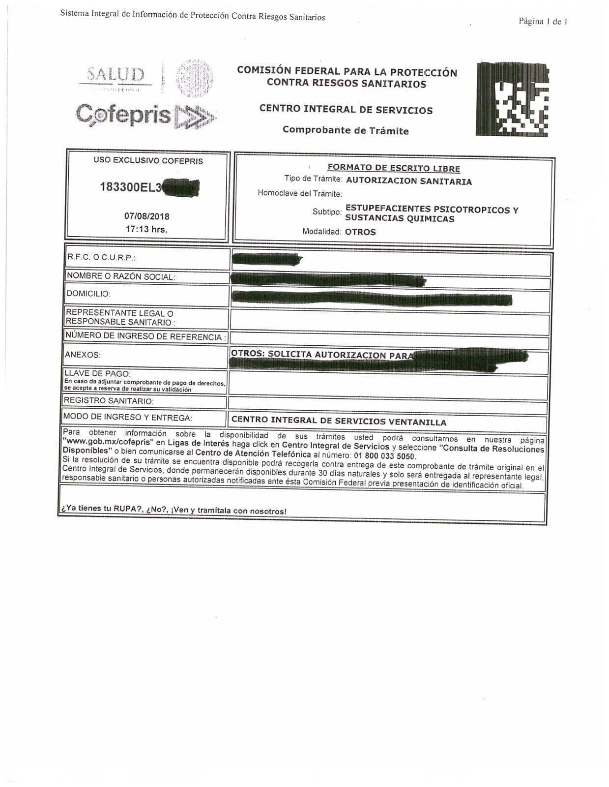 Una vez que entregues la carta a COFEPRIS te deben entregar un formato de seguimiento como este:
