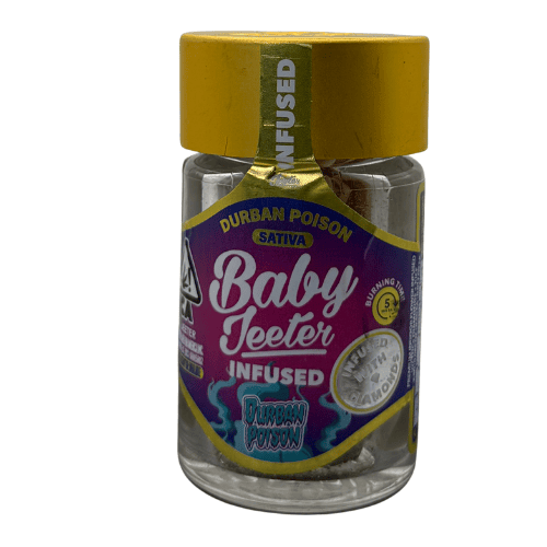 Estos Baby Jeeter Infused edición Durban Poison combinan una genética sativa potente con un triple golpe de potencia: flor molida, infusión con distilado y una cobertura de kief. Esta presentación incluye cinco mini porros de 0.5g cada uno, ideales para dosificar sesiones sin desperdicio. La cepa Durban Poison es reconocida por sus efectos energizantes y su perfil dulce, terroso y especiado.