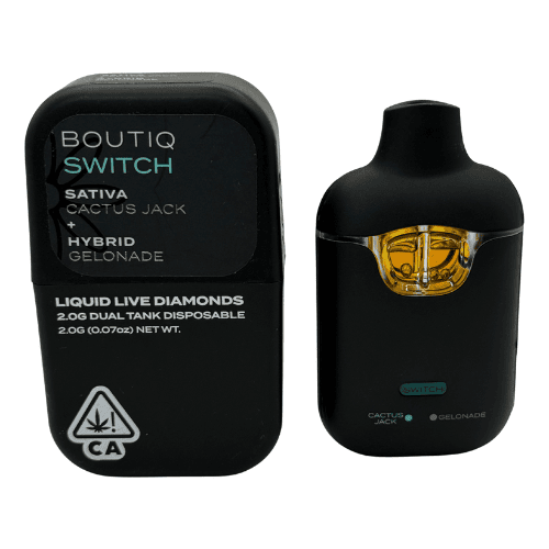 Boutiq Switch reúne lo mejor de dos mundos con su sistema dual tank que permite alternar entre Cactus Jack (Sativa) y Gelonade (Hybrid) sin cambiar de dispositivo. Cada tanque contiene Liquid Live Diamonds, una forma altamente pura y aromática del extracto que conserva terpenos frescos para un efecto más completo y robusto.
