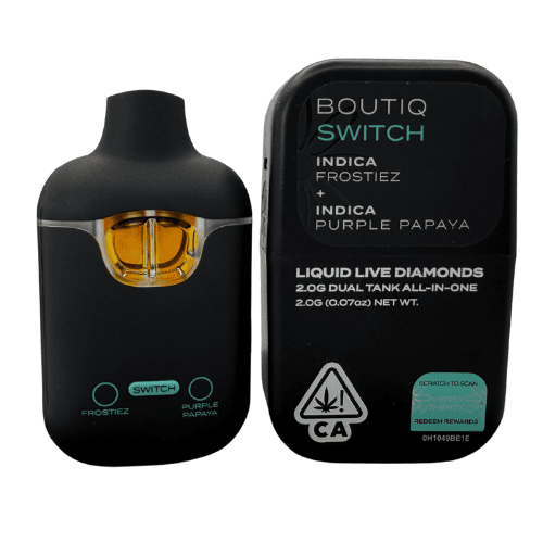 El BOUTIQ SWITCH - Frostiez + Purple Papaya es un dispositivo portátil de vapeo todo en uno que ofrece una experiencia intensa y sedante a través de dos cepas índicas seleccionadas por su perfil relajante y sabor afrutado. Ideal para pacientes que buscan descanso profundo, alivio del dolor o control del estrés. Su tecnología de doble tanque permite alternar entre los efectos suaves de la Purple Papaya y la potencia envolvente de Frostiez con un simple movimiento.