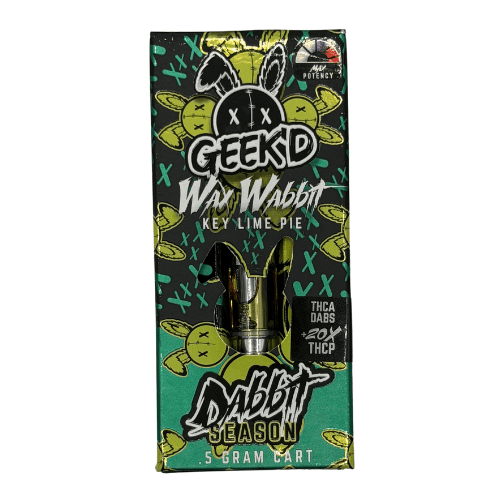 **Wax Wabbit** de la línea **Dabbit Season** de **Geekd** te ofrece una experiencia incomparable con su cartucho de medio gramo (1/2G) de la cepa híbrida **Key Lime Pie**. Esta cepa híbrida es reconocida por su sabor cítrico y su efecto equilibrado, proporcionando una experiencia placentera tanto para el cuerpo como para la mente.